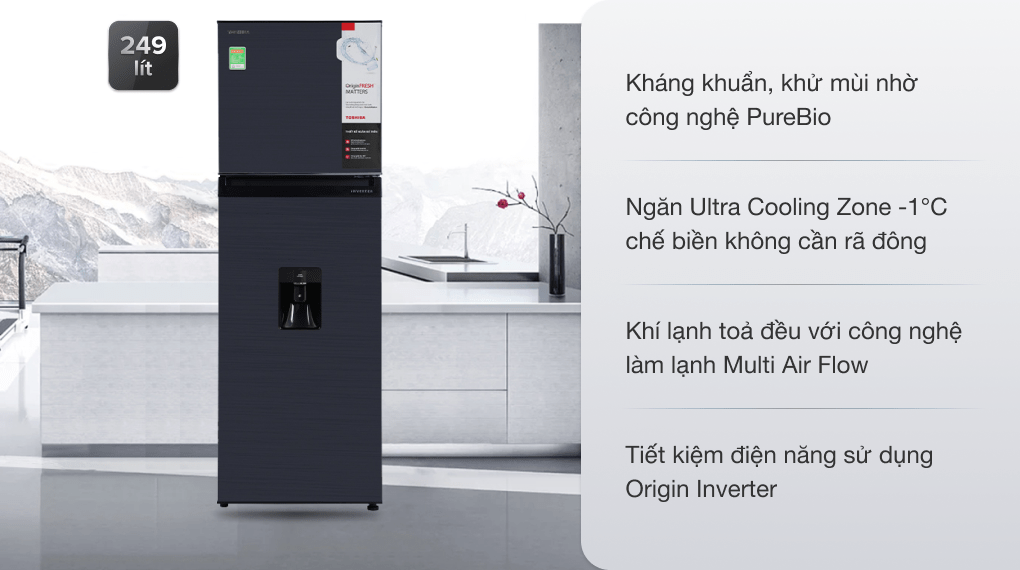Nhìn chung chiếc tủ lạnh Toshiba Inverter 249 lít GR-RT325WE-PMV(06)-MG sở hữu thiết kế bên ngoài hiện đại, ngăn lấy nước ngoài thuận tiện. Đồng thời tích hợp các công nghệ tân tiến như: Inverter, khử mùi Ag+ Bio, hệ thống làm lạnh Multi Air Flow, ngăn cấp đông mềm Ultra Cooling Zone -1°C cùng dung tích sử dụng lớn. Đây sẽ là lựa chọn phù hợp cho gia đình có 2 - 3 thành viên.